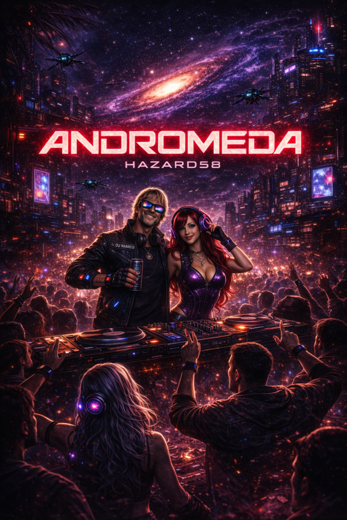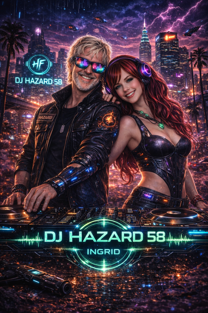 DJ Hazard 58 is an electronic producer and founder of Harmony Fusion Records, building a direct-to-fan cyberpunk EDM system inside the world of Los Angeles, 2130.